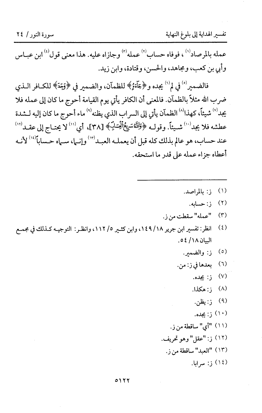 فالضمير في لم يجده و {جَآءَهُ} للظمآن، والضمير في {وَجَدَ} للكافر الذي ضرب الله مثلاً بالظمآن. فالمعنى أن الكافر يأتي يوم القيامة أحوج ما كان إلى عمله فلا يجد شيئاً، كهذا الظمآن يأتي إلى السراب الذي يظنه ماء أحوج ما كان إليه لشدة عطشه فلا يجد شيئاً. وقوله {والله سَرِيعُ الحساب}، أي لا يحتاج إلى عقد عند حساب، هو عالم بذلك كله قبل أن يعمله العبد وإنما، سماه حساباً لأنه أعطاه جزاء عمله على قدر ما استحقه.
