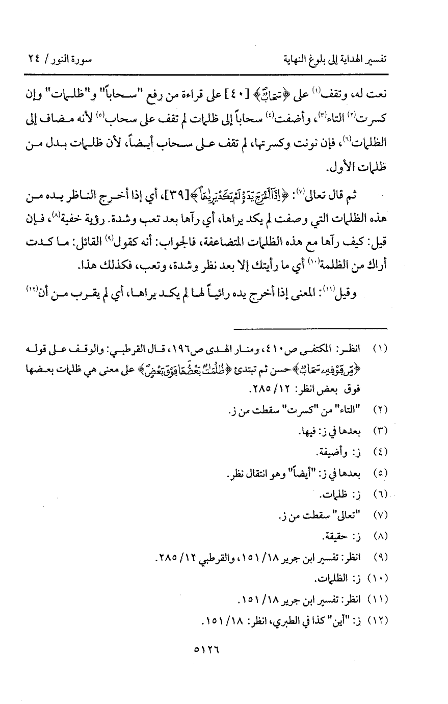 ثم قال تعالى: {إِذَآ أَخْرَجَ يَدَهُ لَمْ يَكَدْ يَرَاهَا}، أي إذا أخرج الناظر يده من هذه الظلمات التي وصفت لم يكد يراها، أي رآها بعد تعب وشدة. رؤية خفية، فإن قيل: كيف رآها مع هذه الظلمات المتضاعفة، فالجواب: أنه كقول القائل: ما كدت أراك من الظلمة أي ما رأيتك إلا بعد نظر وشدة، وتعب، فكذلك هذا.