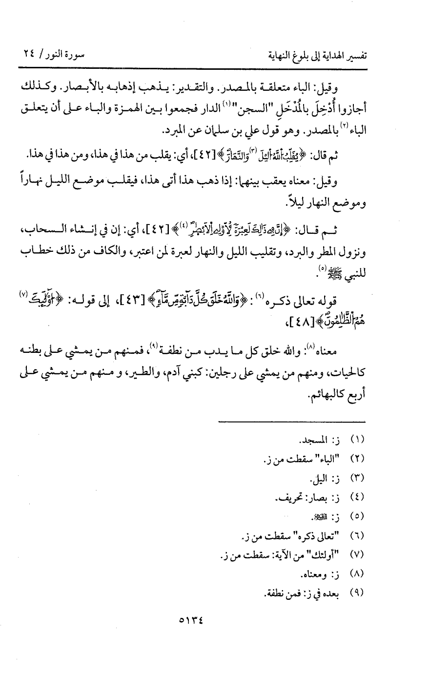معناه: والله خلق كا ما يدب من نطفة، فمنهم من يمشي على بطنه كالحيات، ومنهم من يمشي على رجلين: كبني آدم، والطير، ومنهم من يمشي على أربع كالبهائم.