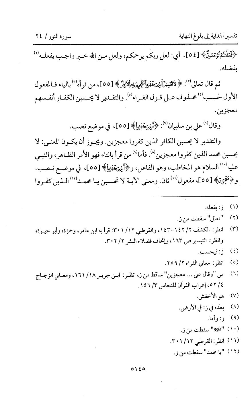 قال تعالى: {لاَ تَحْسَبَنَّ الذين كَفَرُواْ مُعْجِزِينَ فِي الأرض}، من قرأه بالياء فالمفعول الأول لحسب محذوف على قول الفراء. والتقدير لا يحسبن الكفار أنفسهم معجزين.