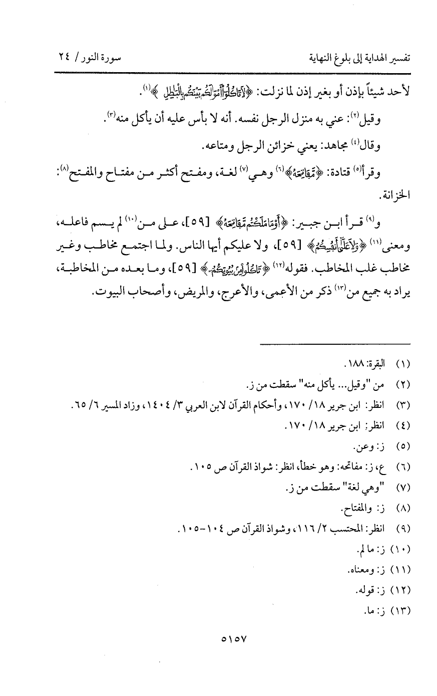 وقرأ ابن جبير: {أَوْ مَا مَلَكْتُمْ مَّفَاتِحهُ}، على من لم يسم فاعله، ومعنى {وَلاَ على أَنفُسِكُمْ}، ولا عليكم أيها الناس. ولما اجتمع مخاطب وغير مخاطب غلب المخاطب. فقوله {أَن تَأْكُلُواْ مِن بُيُوتِكُمْ}، وما بعده من المخاطبة، يراد به جميع من ذكر من الأعمى، والأعرج، والمريض، وأصحاب البيوت.