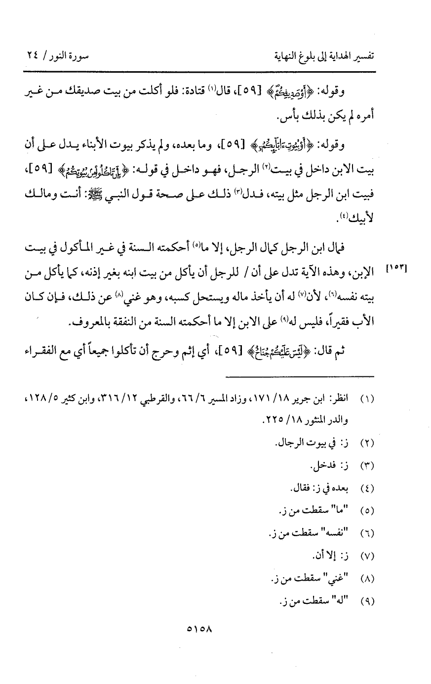 فمال ابن الرجل كمال الرجل، إلا ما أحكمته السنة في غير المأكول في بيت الإبن، وهذه الآية تدل على أن / للرجل أن يأكل من بيت ابنه بغير إذنه، كما يأكل من بيته نفسه، لأن له أن يأخذ ماله ويستحل كسبه، وهو غني عن ذلك، فإن كان الأب فقيراً، فليس له على الابن إلا ما أحكمته السنة من النفقة بالمعروف.