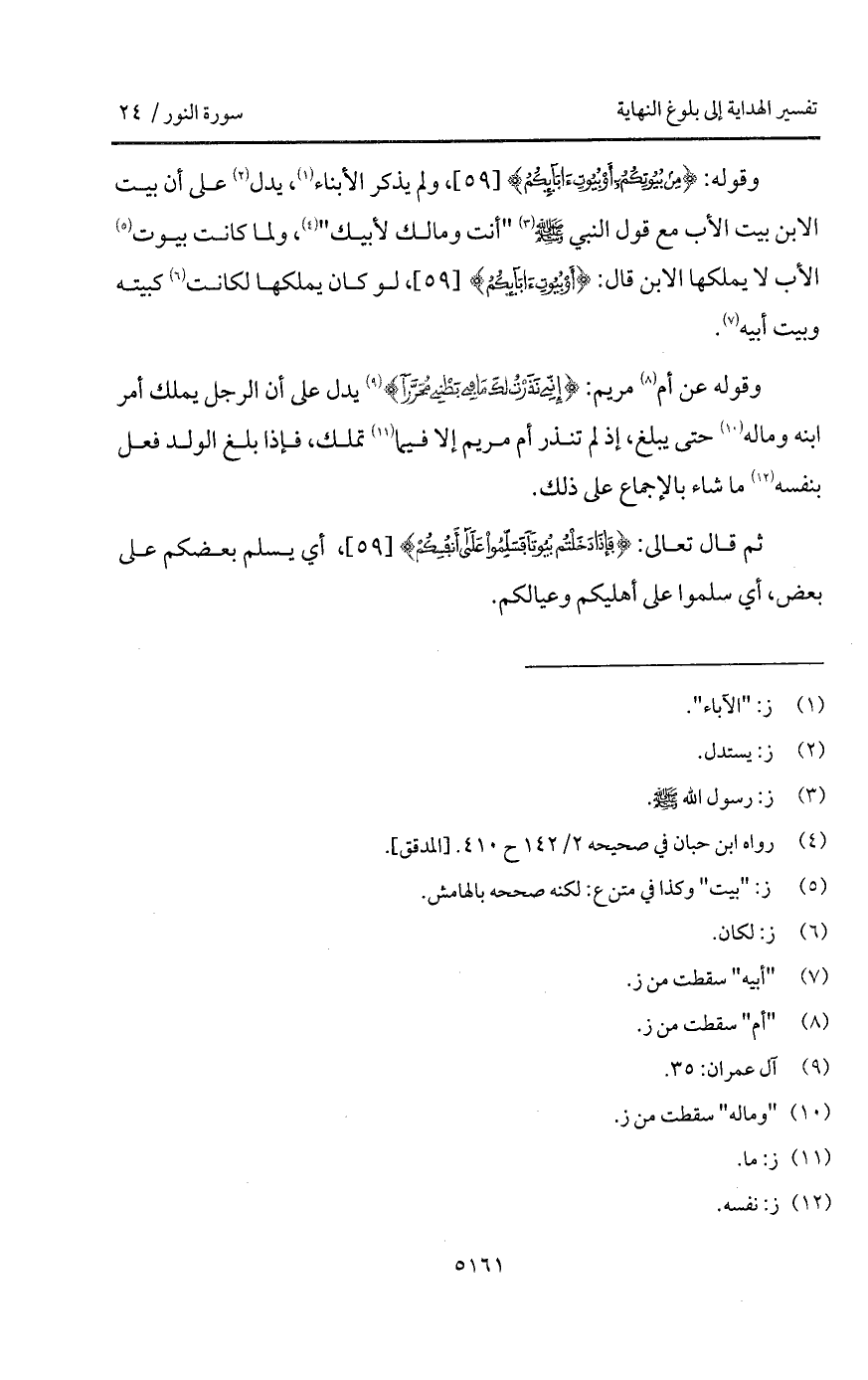 وقوله: {مِن بُيُوتِكُمْ أَوْ بُيُوتِءَابَآئِكُمْ}، ولم يذكر الأبناء، يدل على أن بيت الابن بيت الأب مع قول النبي A " أنت ومالك لأبيك "، ولما كانت بيوت الأب لا يملكها الابن قال: {أَوْ بُيُوتِءَابَآئِكُمْ}، لو كان يملكها لكانت كبيته وبيت أبيه.