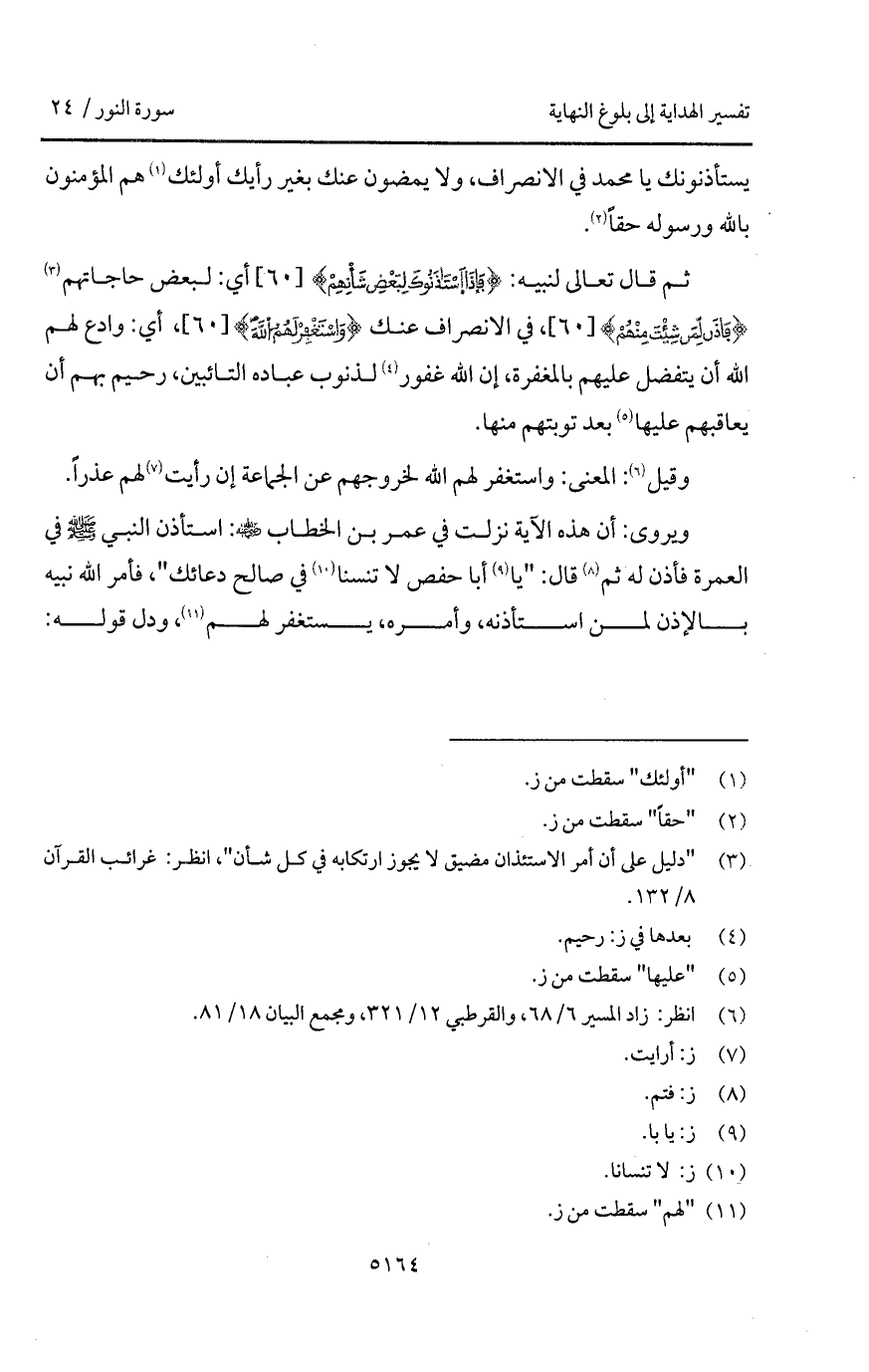 ويروى: أن هذه الآية نزلت في عمر بن الخطاب Bهـ: استأذن النبي A في العمرة فأذن له ثم قال: " يا أبا حفص لا تنسنا في صالح دعائك "، فأمر الله نبيه بالإذن لمن استأذنه، وأمره، يستغفر لهم، ودل قوله: