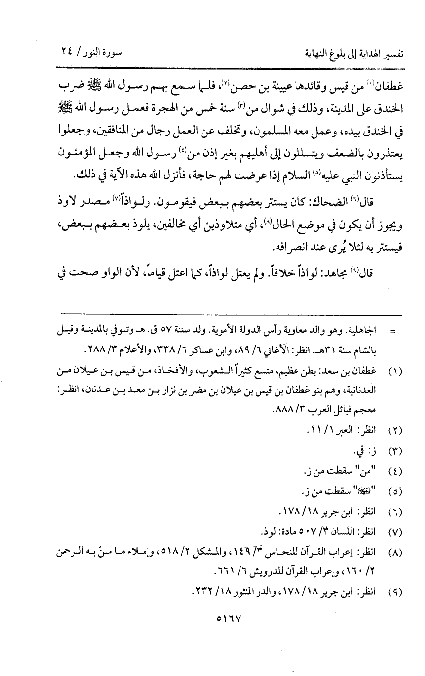 غطفان من قيس وقائدها عيينة بم حصن، فلما سمع بهم رسول الله A ضرب الخندق على المدينة، وذلك في شوال من سنة خمس من الهجرة فعمل رسول الله A في الخندق بيده، وعمل معه المسلمون، وتخلف عن العمل رجال من المنافقين، وجعلوا يعتذرون بالضعف ويتسللون إلى أهليهم بغير إذن من رسول الله وجعل المؤمنون يستأذنون النبي عليه السلام غذا عرضت لهم حاجة، فأنزل الله هذه الآية في ذلك.