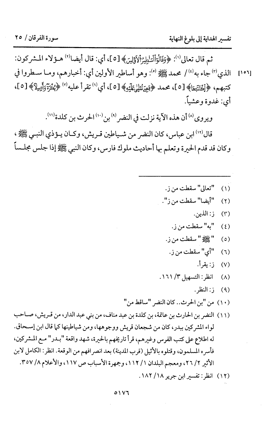 قال ابن عباس، كان النضر من شياطين قريش، وكان يؤذي النبي A، وكان قد قدم الحيرة وتعلم بها أحاديث ملوك فارس، وكان النبي A إذا جلس مجلساً