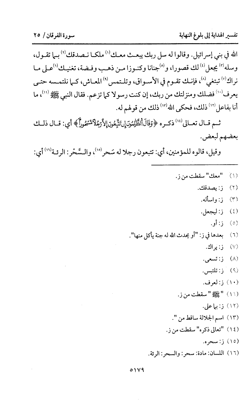 الله في بني إسرائيل. وقالوا له سل ربك يبعث معك ملكا نصدقك بما تقول، وسله يجعل لك قصورا، وجنانا وكنوزا من ذهب وفضة، تغنيك على ما نراك تبتغي، فإنك تقوم في الأسواق، وتلتمس المعاش، كما نلتمسه حتى يعرف فضلك ومنزلتك من ربك، إن كنت رسولا كما تزعم. فقال النبي A، ما أنا بفاعل ذلك، فحكى الله ذلك من قولهم له.