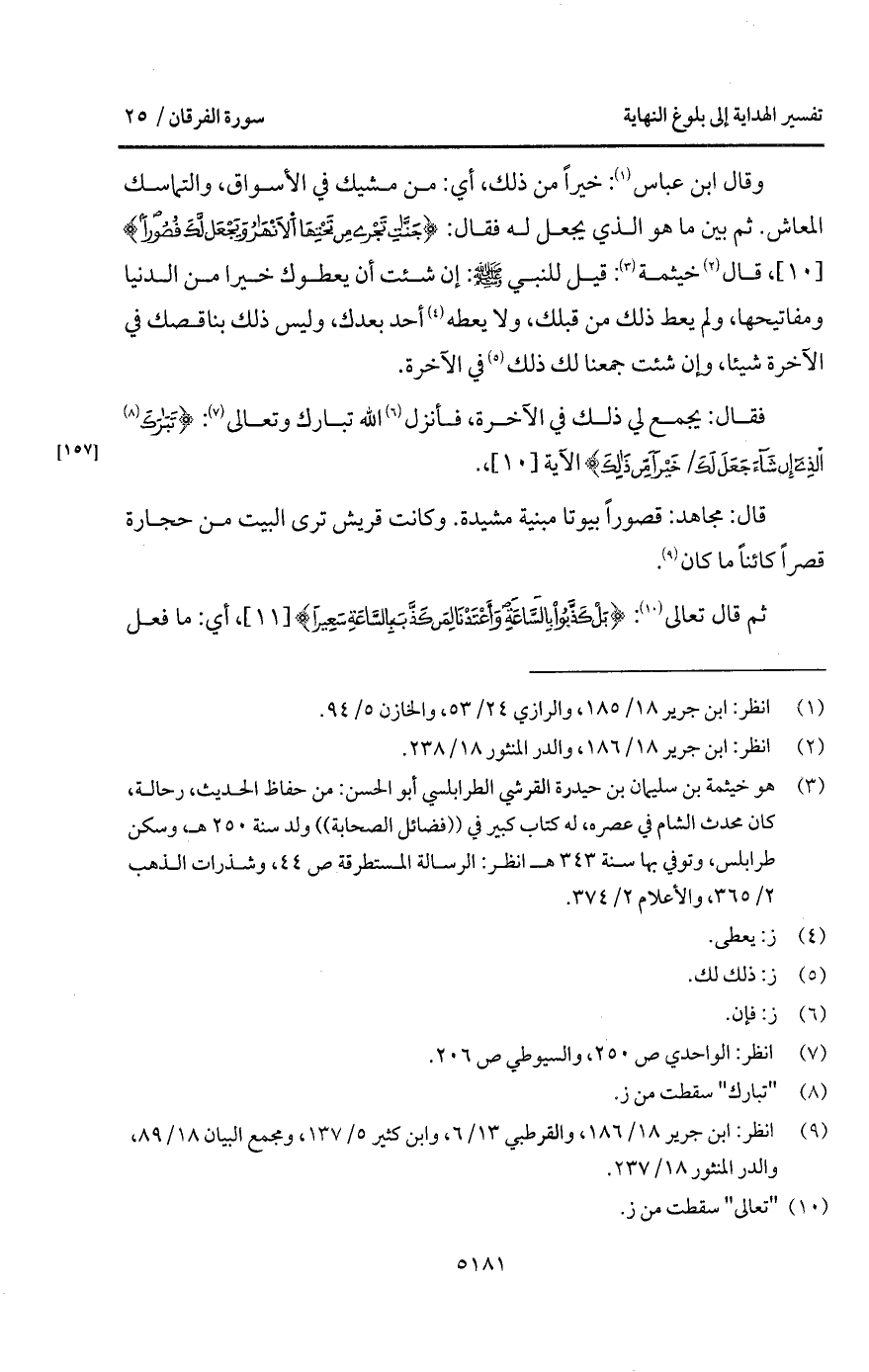 وقال ابن عباس: خيراً من ذلك، أي: من مشيك في الأسواق، والتماسك المعاش. ثم بين ما هو الذي يجعل له فقال: {جَنَّاتٍ تَجْرِي مِن تَحْتِهَا الأنهار وَيَجْعَل لَّكَ قُصُوراً}، قال خيثمة: " قيل للنبي A: إن شئت أن يعطوك خيرا من الدنيا ومفاتيحها، ولم يعط ذلك من قبلك، ولا يعطه أحد بعدك، وليس ذلك يناقصك في الآخرة شيئا، وإن شئت جمعنا لك ذلك في الآخرة.