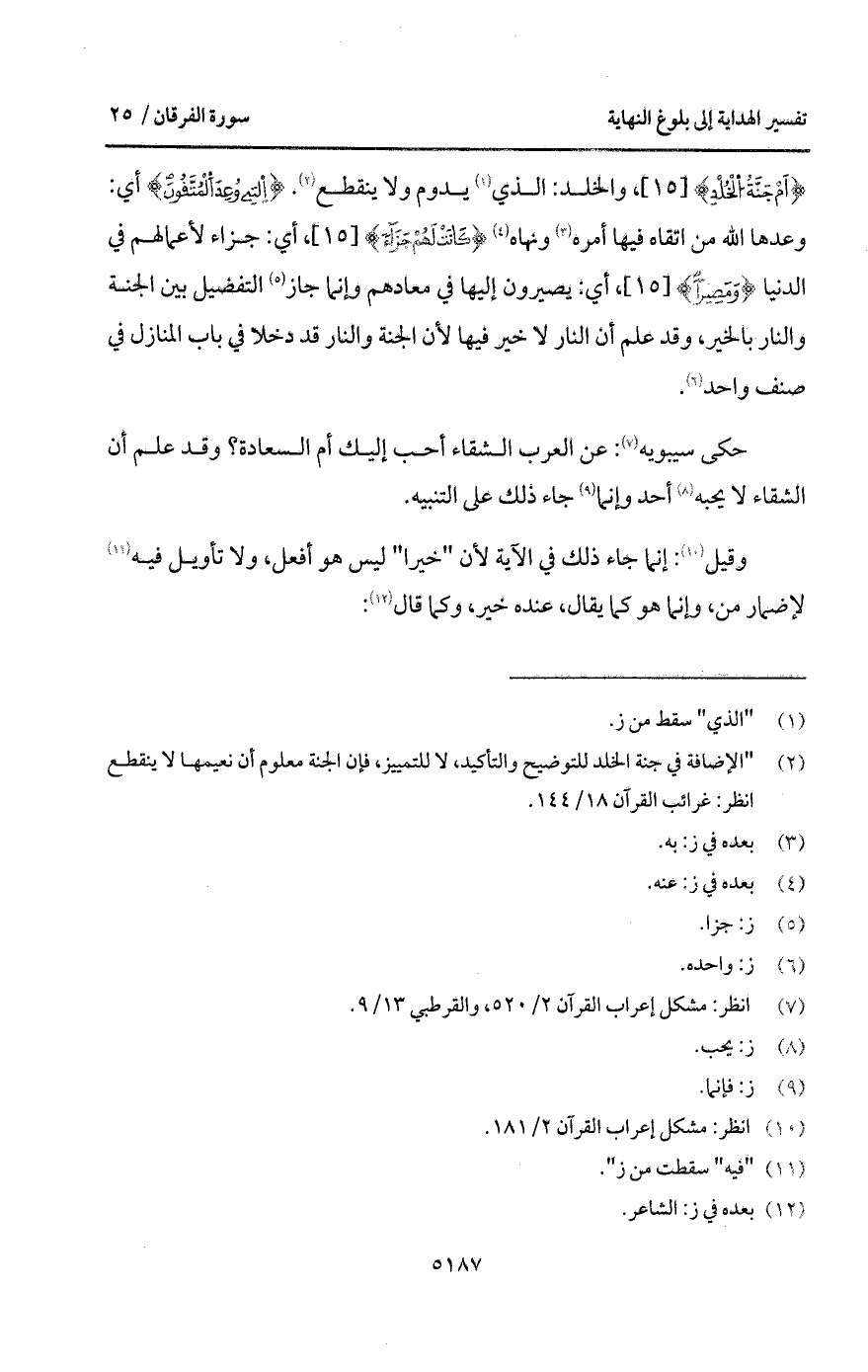 {أَمْ جَنَّةُ الخلد}، والخلد: الذي يدوم ولا ينقطع. {التي وُعِدَ المتقون} أي: وعدها الله من اتقاه فيها أمره ونهاه {كَانَتْ لَهُمْ جَزَآءً}، أي: جزاء لأعمالهم في الدنيا {وَمَصِيراً}، أي: يصيرون إليها في معادهم وإنما جاز التفضيل بين الجنة والنار بالخير، وقد علم أن النار لا خير فيها لأن الجنة والنار قد دخلا في باب المنازل في صنف واحد.