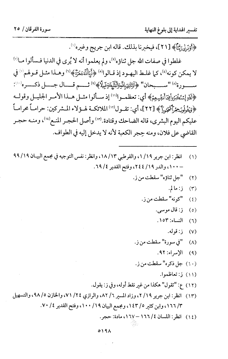 غلطوا في صفات الله جل ثناؤه، ولم يعلموا أنه لا يُرى في الدنيا فسألوا ما لا يمكن كونه، كما غلط اليهود إذ قالوا {أَرِنَا الله جَهْرَةً} [النساء: 153] وهذا مثل قولهم في سورة " سبحان " {أَوْ تَأْتِيَ بالله والملائكة قَبِيلاً} [الإسراء: 92] ثم قال جل ذكره: {لَقَدِ استكبروا في أَنفُسِهِمْ} أي: تعظموا إذ سألوا مثل هذا الأمر الجليل وقوله {وَيَقُولُونَ حِجْراً مَّحْجُوراً}، أي: تقول الملائكة لهؤلاء المشركين: حراماً محراماً عليكم اليوم البشرى، قاله الضاحك وقتادة. وأصل الحجر المنع، ومنه حجر القاضي على فلان، ومنه حِجر الكعبة لأنه لا يدخل إليه في الطواف.