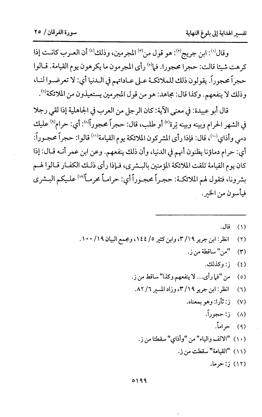 قال أبو عبيدة: في معنى الآية: كان الرجل من العرب في الجاهلية إذا لقي رجلا في الشهر الحرام وبينه وبينه تِرة أو طلب، قال: حجراً محجوراً: أي: حرام عليك دمي وأذاي، قال: فإذا رأى المشركون الملائكة يوم القيامة قالوا: حجراً محجوراً: أي: حرام دماؤنا يظنون أنهم في الدنيا، وأن ذلك ينفعهم. وعن ابن عمر أنه قال: إذا كان يوم القيامة تلقت الملائكة المؤمنين بالبشرى، فإذا رأى ذلك الكفار قالوا لهم بشرونا، فتقول لهم الملائكة: حجراً محجوراً أي: حراماً محرماً عليكم البشرى فيأسون من الخير.