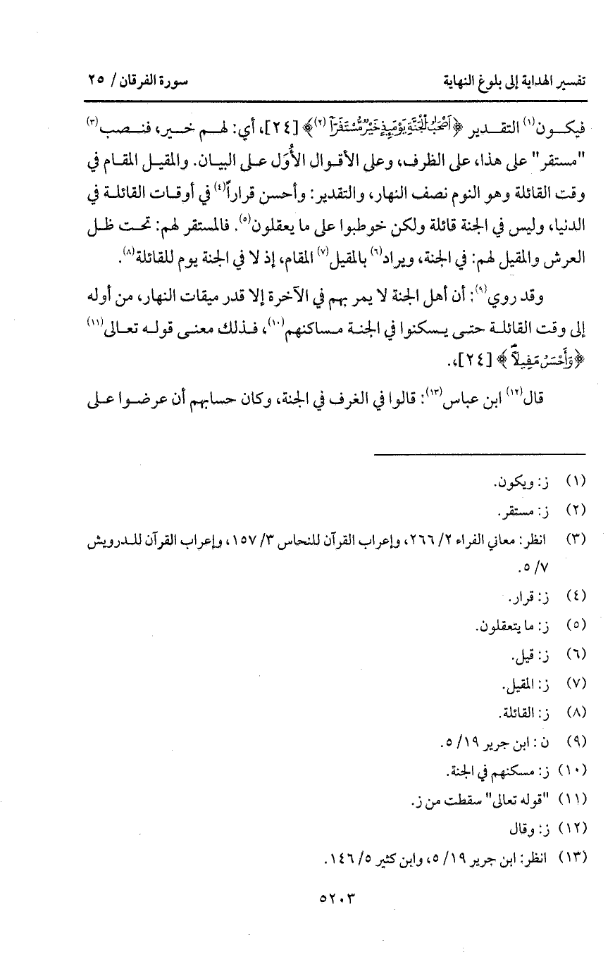 فيكون التقدير {أَصْحَابُ الجنة يَوْمَئِذٍ خَيْرٌ مُّسْتَقَرّاً}، أي: لهم خير، فنصب " مستقر " على هذا، على الظرف، وعلى الأقوال الأُوَل على البيان. والمقيل المقام في وقت القائلة وهو النوم نصف النهار، والتقدير: وأحسن قراراً في أوقات القائلة في الدنيا، وليس في الجنة قائلة ولكن خوطبوا على ما يعقلون. فالمستقر لهم: تحت ظل العرش والمقيل لهم: في الجنة، ويراد بالمقيل المقام، إذ لا في الجنة يوم للقائلة.