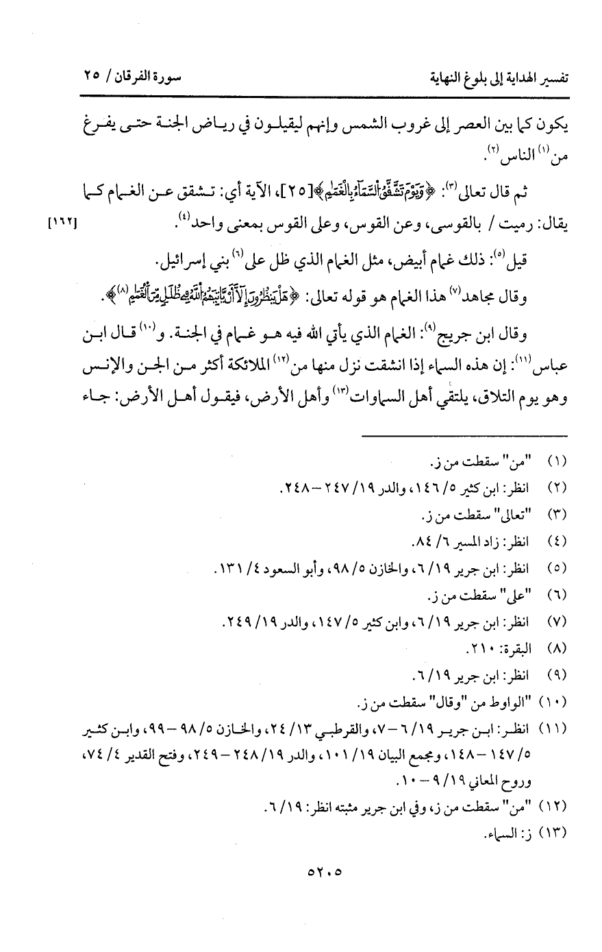 وقال ابن جريج: الغمام الذي يأتي الله فيه هو غمام في الجنة. وقال ابن عباس: إن هذه السماء إذا انشقت نزل منها من الملائكة أكثر من الجن والإنس وهو يوم التلاق، يلتقي أهل السماوات وأهل الأرض، فيقول أهل الأرض: جاء