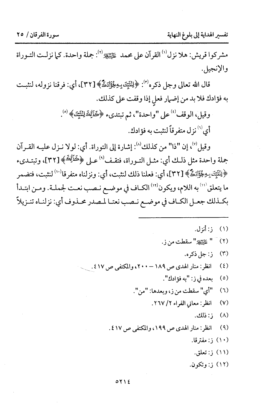 قال الله تعالى وجل ذكره: {لِنُثَبِّتَ بِهِ فُؤَادَكَ}، أي: فرقنا نزوله، لنثبت به فؤادك فلا بد من إضمار فعلٍ إذا وقفت على كذلك.