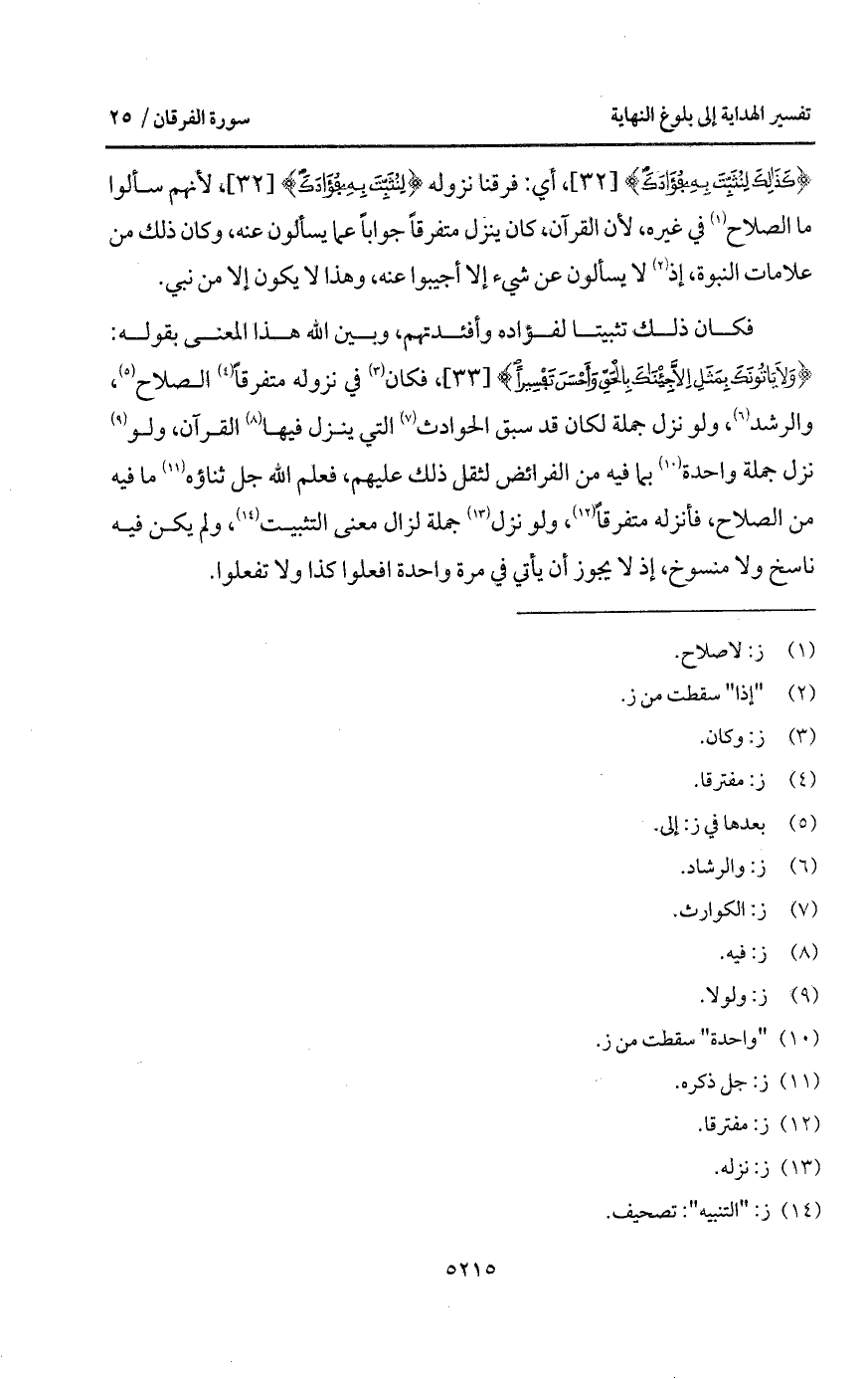 فكان ذلك تثبيتا لفؤاده وأفئدتهم، وبين الله هذا المعنى بقوله: {وَلاَ يَأْتُونَكَ بِمَثَلٍ إِلاَّ جِئْنَاكَ بالحق وَأَحْسَنَ تَفْسِيراً} [الفرقان: 33]، فكان في نزوله متفرقاً الصلاح، والرشد، ولو نزل جملة لكان قد سبق الحوادث التي ينزل فيها القرآن، ولو نزل جملة واحدة بما فيه من الفرائض لثقل ذلك عليهم، فعلم الله جل ثناؤه ما فيه من الصلاح، فأنزله متفرقاً، ولو نزل جملة لزال معنى التثبيت، ولم يكن فيه ناسخ ولا منسوخ، إذ لا يجوز أن يأتي في مرة واحدة افعلوا كذا ولا تفعلوا.