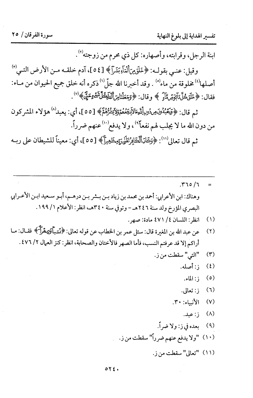 وقيل: عني بقوله: {خَلَقَ مِنَ المآء بَشَراً}، آدم خلقه من الأرض التي أصلها مخلوقة من ماء. وقد أخبرنا الله جلّ ذكره أنه خلق جميع الحيوان من ماء: فقال: {خَلَقَ كُلَّ دَآبَّةٍ مِّن مَّآءٍ} وقال: {وَجَعَلْنَا مِنَ المآء كُلَّ شَيْءٍ حَيٍّ} [الأنبياء: 30].