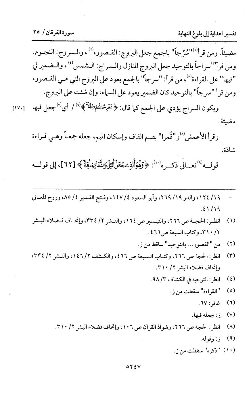 مضيئاً. ومن قرأ " سُرُجاً " بالجمع جعل البروج: القصور،، والسروج: النجوم. ومن قرأ سراجاً بالتوحيد جعل البروج المنازل والسراج: الشمس، والضمير في " فيها " على القراءة، من قرأ: " سرجاً " بالجمع يعود على البروج التي هي القصور، ومن قرأ " سرجاً " بالتوحيد كان الضمير يعود على السماء، وإن شئت على البروج.