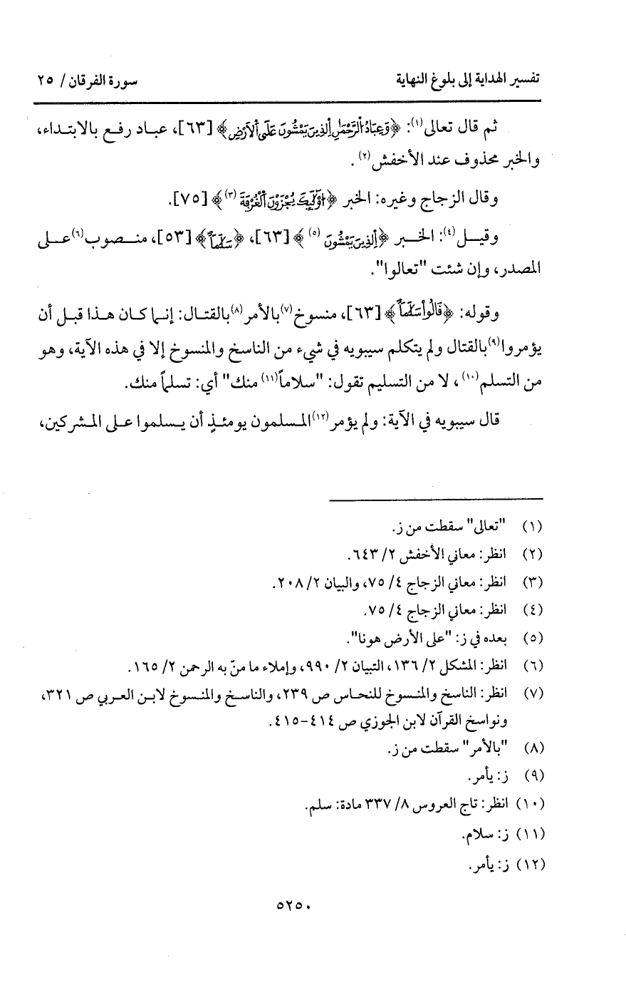 وقوله: {قَالُواْ سَلاَماً}، منسوخ بالأمر بالقتال: إنما كان هذا قبل أن يؤمروا بالقتال ولم يتكلم سيبويه في شيء من الناسخ والمنسوخ إلا في هذه الآية، وهو من التسليم، لا من التسليم تقول: " سلاماً منك " أي: تسلماً منك.