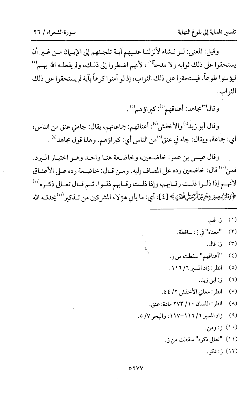 وقال أبو زيد والأخفش: أعناقهم: جماعاتهم، يقال: جاءني عنق من الناس، أي: جماعة، ويقال: جاء في عنق من الناس أي: كبراؤهم. وهذا قول مجاهد.