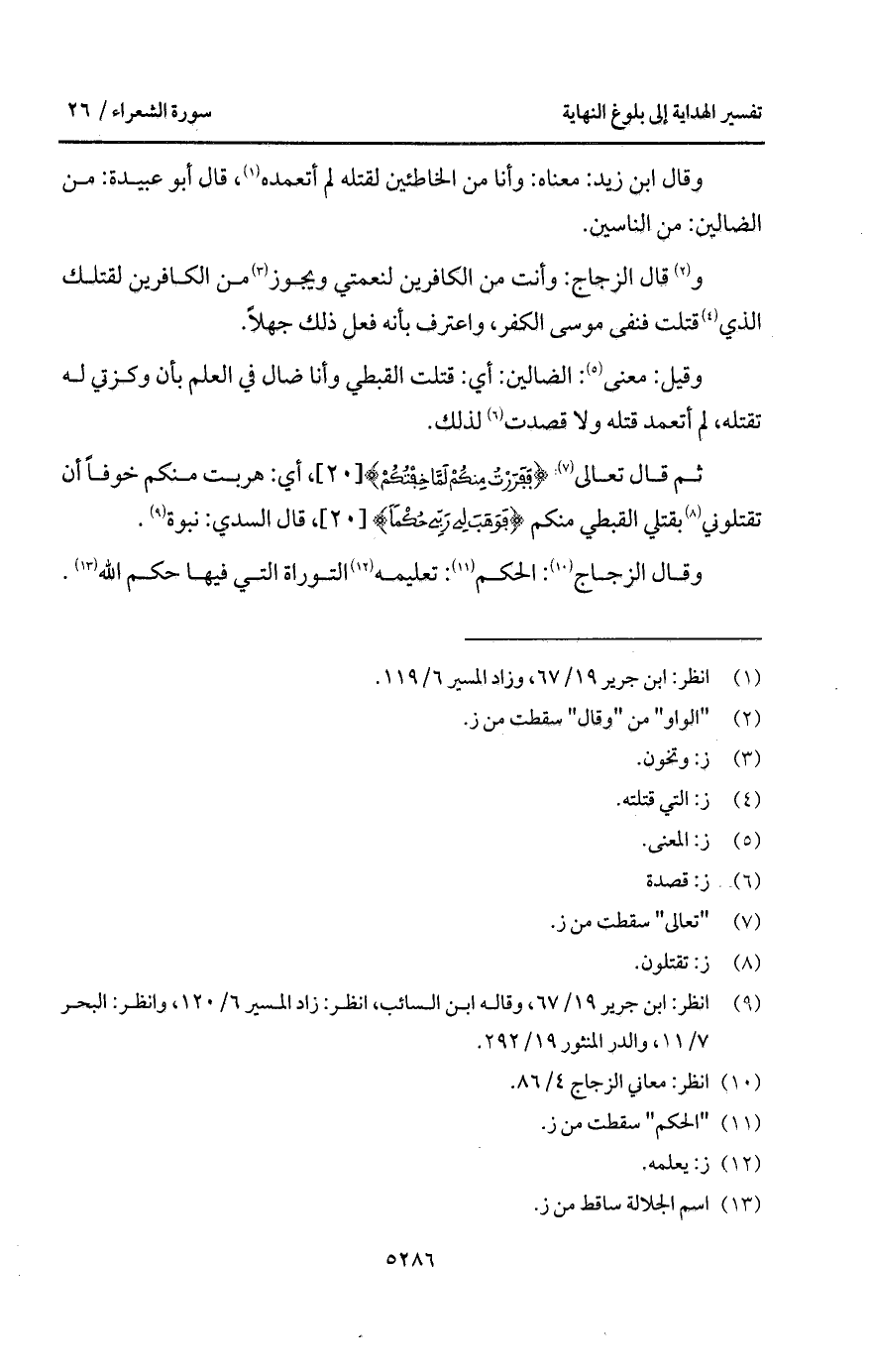 وقال الزجاج: وأنت من الكافرين لنعمتي ويجوز من الكافرين لقتلك الذي قتلت فنفى موسى الكفر، واعترف بأنه فعل ذلك جهلاً.