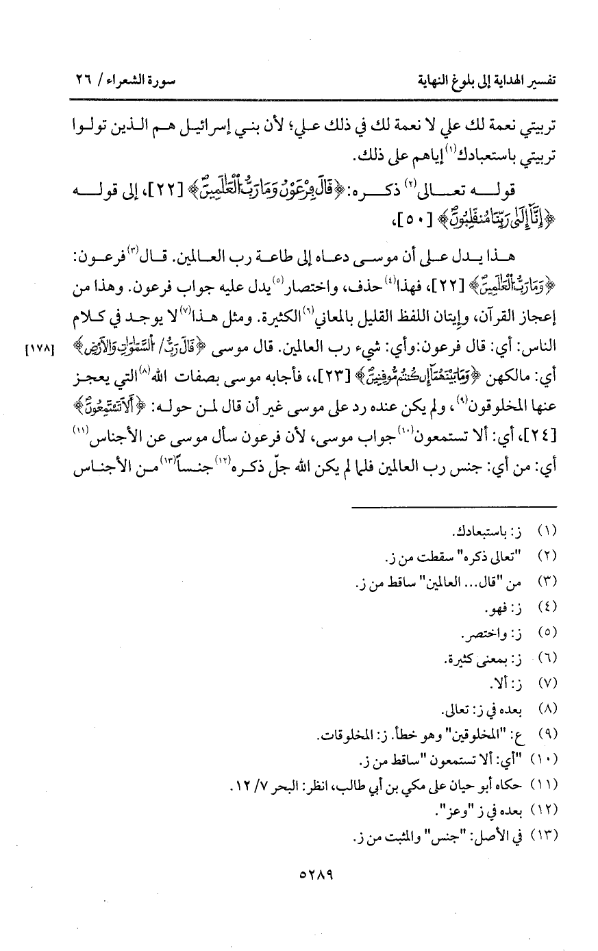 هذا يدل على أن موسى دعاه إلى طاعة رب العالمين. قال فرعون: {وَمَا رَبُّ العالمين}، فهذا حذف، واختصار يدل عليه جواب فرعون. وهذا من إعجاز القرآن، وإيتان اللفظ القليل بالمعاني الكثيرة. ومثل هذا لا يوجد في كلام الناس: أي: قال فرعون: وأي: شيء رب العالمين. قال موسى {قَالَ رَبُّ / السماوات والأرض} أي: مالكهن {وَمَا بَيْنَهُمَآ إِن كُنتُمْ مُّوقِنِينَ}، فأجابه موسى بصفات الله التي يعجز عنها المخلوقون، ولم يكن عنده رد على موسى غير أن قال لمن حوله: {أَلاَ تَسْتَمِعُونَ}، أي: ألا تستمعون جواب موسى، لأن فرعون سأل موسى عن الأجناس أي: من أي: جنس رب العالمين فلما لم يكن الله جلّ ذكره جنساً من الأجناس