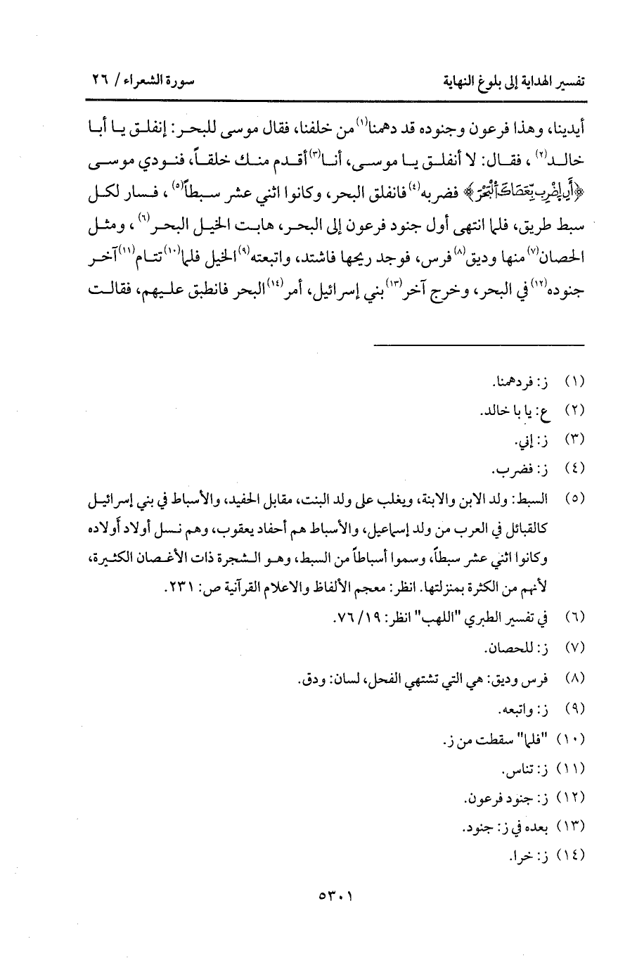 أيدينا، وهذا فرعون وجنوده قد دهمنا من خلفنا، فقال موسى للبحر: إنفلق يا أبا خالد، فقال: لا أنفلق يا موسى، أنا أقدم منك خلقاً، فنودي موسى {أَنِ اضرب بِّعَصَاكَ الحجر} فضربه فانفلق البحر، وكانوا اثني عشر سبطاً، فسار لكل سبط طريق، فلما انتهى أول جنود فرعون إلى البحر، هابت الخيل البحر، ومثل الحصان منها وديق فرس، فوجد ريحها فاشتد، واتبعته الخيل فلما تتام آخر جنوده في البحر، وخرج آخر بني إسرائيل، أمر البحر فانطبق عليهم، فقالت