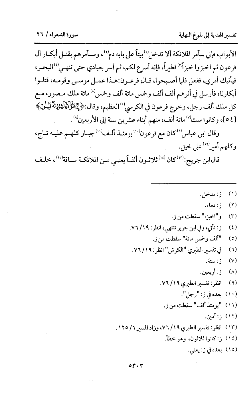 الأبواب فإني سآمر الملائكة ألا تدخل بيتاً على بابه دم، وسآمرهم بقتل أبكار آل فرعون ثم أخبزوا خبزاً فطيراً، فإنه أسرع لكم، ثم أسر بعبادي حتى تنهي البحر، فيأتيك أمري، ففعل فلما أصبحوا، قال فرعون: هذا عمل موسى وقومه، قتلوا أبكارنا، فأرسل في أثرهم ألف ألف وخمس مائة ألف وخمس مائة ملك مصور، مع كل ملك ألف رجل، وخرج فرعون في الكرسي العظيم، وقال: {إِنَّ هؤلاء لَشِرْذِمَةٌ قَلِيلُونَ}، وكانوا ست مائة ألف، منهم أبناء عشرين سنة إلى الأربعين.