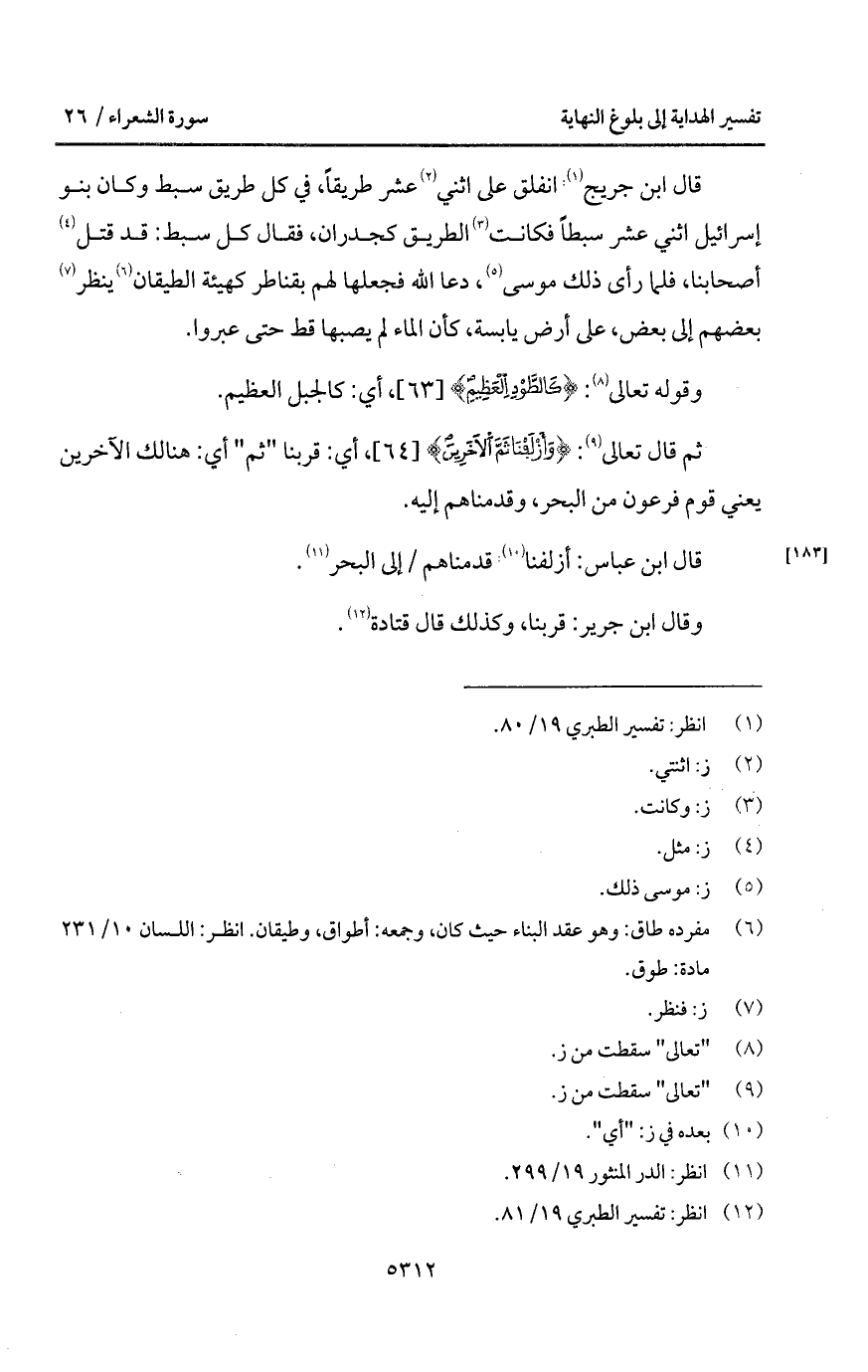 قال ابن جريج انفلق على اثني عشر طريقاً، في كل طريق سبط وكان بنو إسرائيل اثني عشر سبطاً فكانت الطريق كجدران، فقال كل سبط: قد قتل أصحابنا، فلما رأى ذلك موسى، دعا الله فجعلها لهم بقناطر كهيئة الطيقان ينظر بعضهم إلى بعض، على أرض يابسة، كأن الماء لم يصبها قط حتى عبروا.