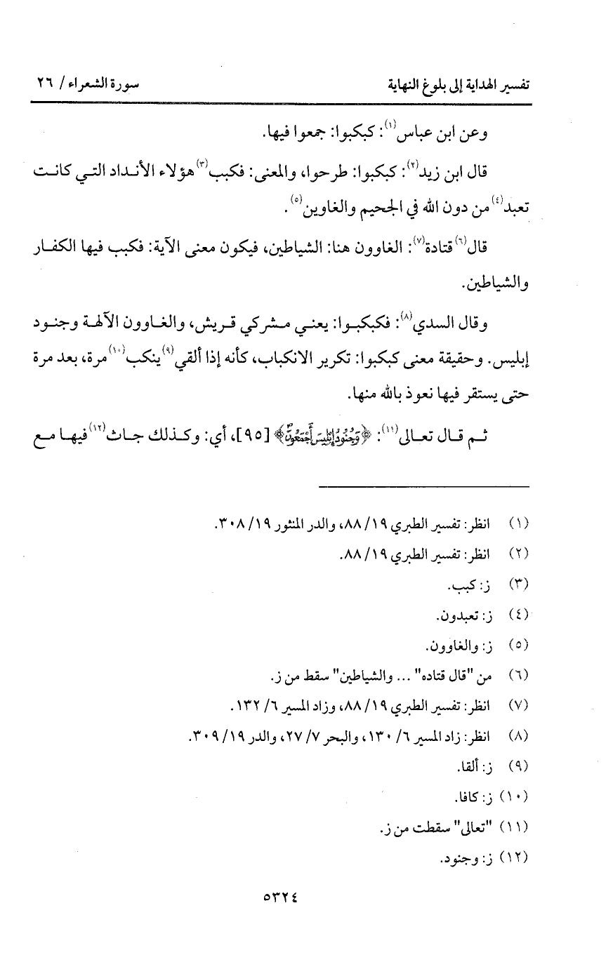 وقال السدي: فكبكبوا: يعني مشركي قريش، والغاوون الآلهة وجنود إبليس. وحقيقة معنى كبكبوا: تكرير الانكباب، كأنه إذا ألقي ينكب مرة، بعد مرة حتى يستقر فيها نعوذ بالله منها.