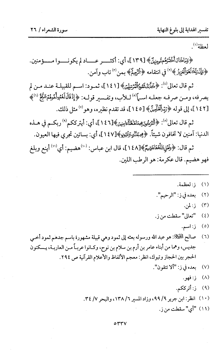 قال تعالى: {كَذَّبَتْ ثَمُودُ المرسلين}، ثمود: اسم للقبيلة عند من لم يصرفه، ومن صرفه جعله اسماً للأب، وتفسير قوله: {إِذْ قَالَ لَهُمْ أَخُوهُمْ صَالِحٌ}، إلى قوله {رَبِّ العالمين}، قد تقدم نظيره، وهو مثل ذلك.