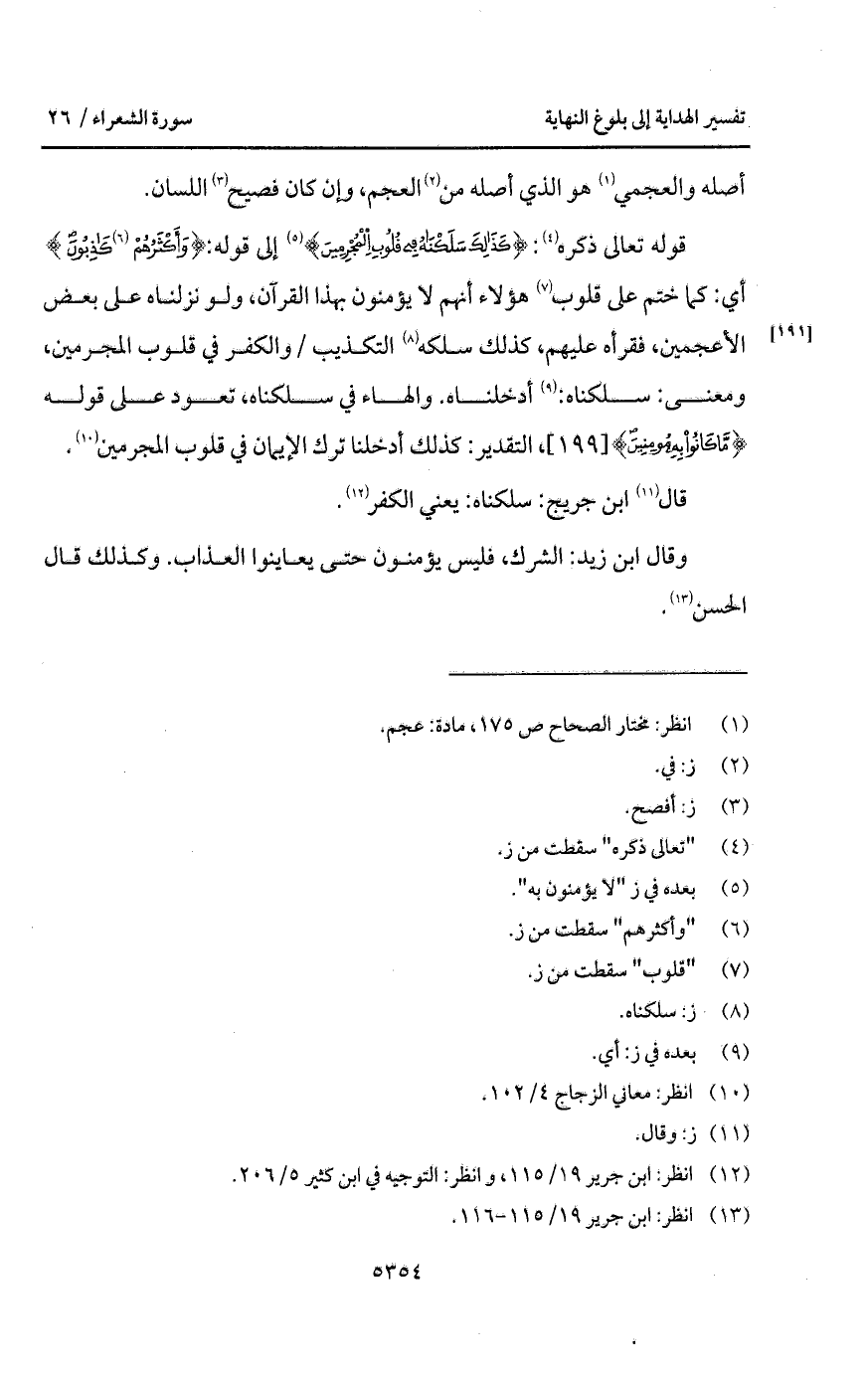 قوله تعالى ذكره: {كَذَلِكَ سَلَكْنَاهُ فِي قُلُوبِ المجرمين} إلى قوله: {وَأَكْثَرُهُمْ كَاذِبُونَ} أي: كما ختم على قلوب هؤلاء أنهم لا يؤمنون بهذا القرآن، ولو نزلناه على بعض الأعجمين، فقرأه عليهم، كذلك سلكه التكذيب / والكفر في قلوب المجرمين، ومعنى: سلكناه: أدخلناه. والهاء في سلكناه، تعود على قوله {مَّا كَانُوا بِهِ مُؤْمِنِينَ}، التقدير: كذلك أدخلنا ترك الإيمان في قلوب المجرمين.