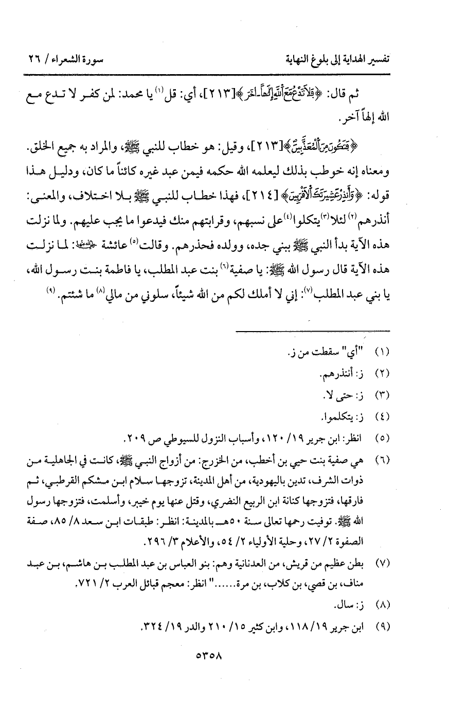 {فَتَكُونَ مِنَ المعذبين}، وقيل: هو خطاب للنبي A، والمراد به جميع الخلق. ومعناه إنه خوطب بذلك ليعلمه الله حكمه فيمن عبد غيره كائناً ما كان، ودليل هذا قوله: {وَأَنذِرْ عَشِيرَتَكَ الأقربين}، فهذا خطاب للنبي A بلا اختلاف، والمعنى: أنذرهم لئلا يتكلوا على نسبهم، وقرابتهم منك فيدعوا ما يجب عليهم. " ولما نزلت هذه الآية بدأ النبي A ببني جده، وولده فحذرهم " وقالت عائشة Bها: " لما نزلت هذه الآية قال رسول الله A: يا صفية بنت عبد المطلب، يا فاطمة بنت رسول الله، يا بني عبد المطلب: إني لا أملك لكم من الله شيئاً، سلوني من مالي ما شئتم ".