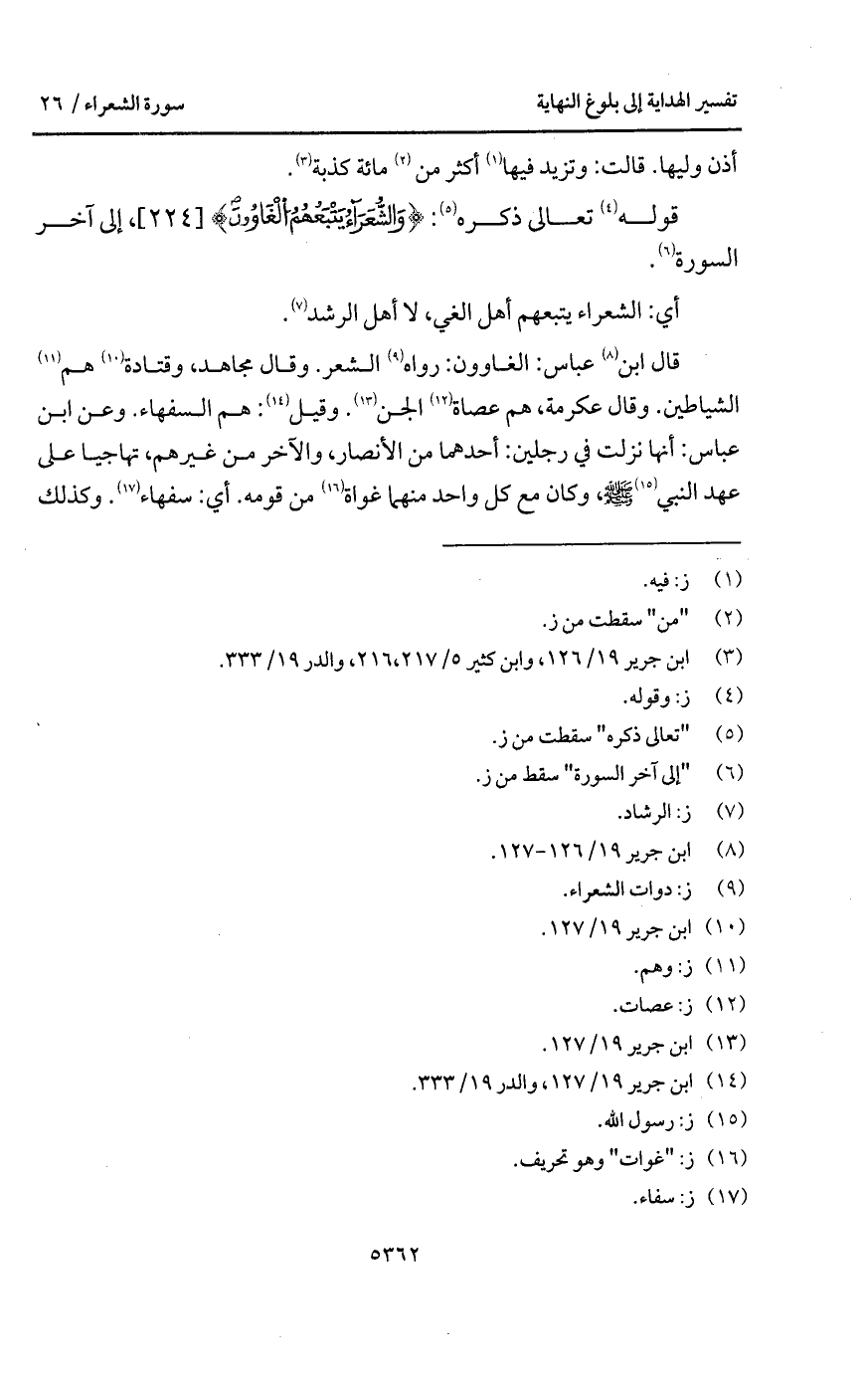 قال ابن عباس: الغاوون: رواه الشعر. وقال مجاهد، وقتادة هم الشياطين. وقال عكرمة، هم عصاة الجن. وقيل: هم السفهاء. وعن ابن عباس: أنها نزلت في رجلين: أحدهما من الأنصار، والآخر من غيرهم، تهاجيا على عهد النبي A، وكان مع كل واحد منهما غواة من قومه. أي: سفهاء. وكذلك