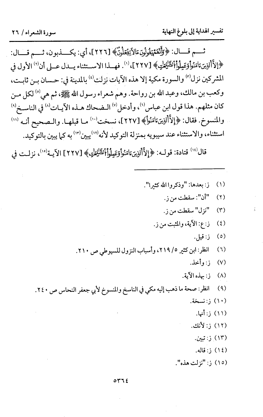 قال: {وَأَنَّهُمْ يَقُولُونَ مَا لاَ يَفْعَلُونَ}، أي: يكذبون، ثم قال: {إِلاَّ الذين آمَنُواْ وَعَمِلُواْ الصالحات}،. فهذا الاستثناء يدل على أن الأول في المشركين نزل والسورة مكية إلا هذه الآيات نزلت بالمدينة في: حسان بن ثابت، وكعب بن مالك، وعبد الله بن رواحة. وهم شعراء رسول الله A، ثم هي لكل من كان مثلهم. هذا قول ابن عباس، وأدخل الضحاك هذه الآيات في الناسخ والمنسوخ. فقال: {إِلاَّ الذين آمَنُواْ}، نسخت ما قبلها. والصحيح أنه استثناء والاستثناء عند سيبويه بمنزلة التوكيد لأنه يبين به كما يبين بالتوكيد.