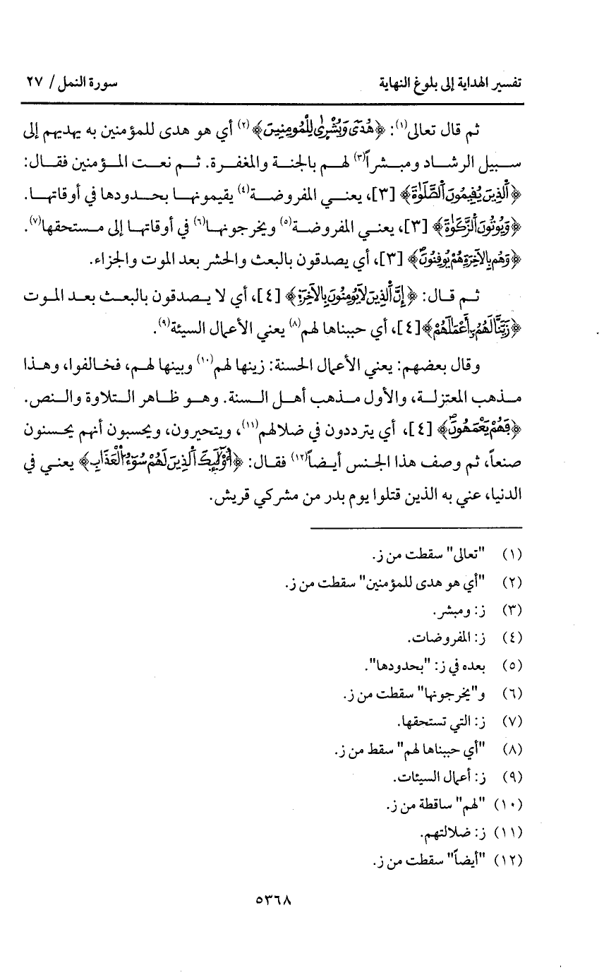 قال تعالى: {هُدًى وبشرى لِلْمُؤْمِنِينَ} أي هو هدى للمؤمنين به يهديهم إلى سبيل الرشاد ومبشراً لهم بالجنة والمغفرة. ثم نعت المؤمنين فقال: {الذين يُقِيمُونَ الصلاة}، يعني المفروضة يقيمونها بحدودها في أوقاتها. {وَيُؤْتُونَ الزكاة}، يعني المفروضة ويخرجونها في أوقاتها إلى مستحقها. {وَهُم بالآخرة هُمْ يُوقِنُونَ}، أي يصدقون بالبعث والحشر بعد الموت والجزاء.