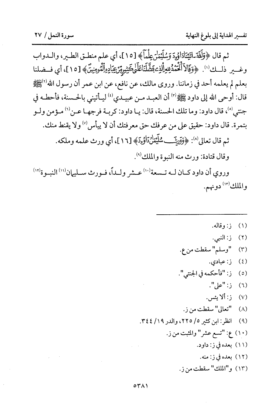 ثم قال {وَلَقَدْ آتَيْنَا دَاوُودَ وَسُلَيْمَانَ عِلْماً}، أي علم منطق الطير، والدواب وغير ذلك. {وَقَالاَ الحمد لِلَّهِ الذي فَضَّلَنَا على كَثِيرٍ مِّنْ عِبَادِهِ المؤمنين}، أي فضلنا بعلم لم يعلمه أحد في زماننا. وروى مالك، عن نافع، عن ابن عمر أن رسول الله A قال: " أوحى الله إلى داود A أن العبد من عبيدي ليأتيني بالحسنة، فأحطه في جنتي، قال داود: وما تلك الحسنة، قال: يا داود: كربة فرجها عن مؤمن ولو بتمرة. قال داود: حقيق على من عرفك حق معرفتك أن ييأس ولا يقنط منك ".