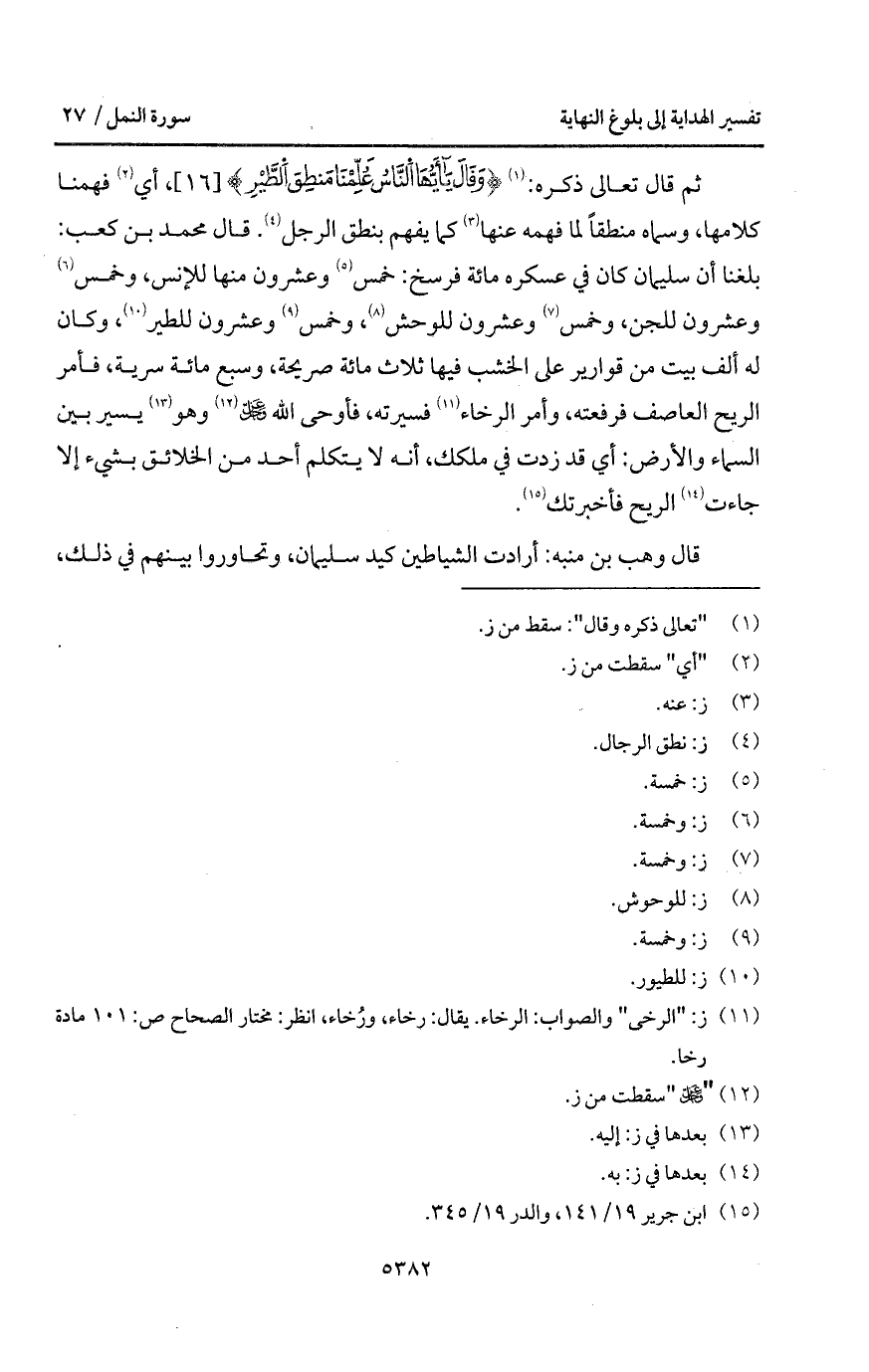 ثم قال تعالى ذكره: {وَقَالَ يا أيها الناس عُلِّمْنَا مَنطِقَ الطير}، أي فهمنا كلامها، وسماه منطقاً لما فهمه عنها كما يفهم بنطق الرجل. قال محمد بن كعب: بلغنا أن سليمان كان في عسكره مائة فرسخ: خمس وعشرون منها للإنس، وخمس وعشرون للجن، وخمس وعشرون للوحش، وخمس وعشرون للطير، وكان لع ألف بيت من قوارير على الخشب فيها ثلاث مائة صريحة، وسبع مائة سرية، فأمر الريح لعاصف فرفعته، وأمر الرخاء فسيرته، فأوحى الله D وهو يسير بين السماء والأرض: أي قد زدت في ملكك، أنه لا يتكلم أحد من الخلائق بشيء إلا جاءت الريح فأخبرتك.