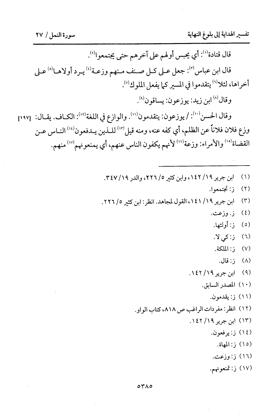 وقال الحسن: / يوزعون يتقدمون. والوازع في اللغة: الكاف: يقال: وزع فلان فلاناً عن الظلم، أي كفه عنه، ومنه قيل للذين يدفعون الناس عن القضاة والأمراء: وزعة لأنهم يكفون الناس عنهم، أي يمنعونهم منهم.