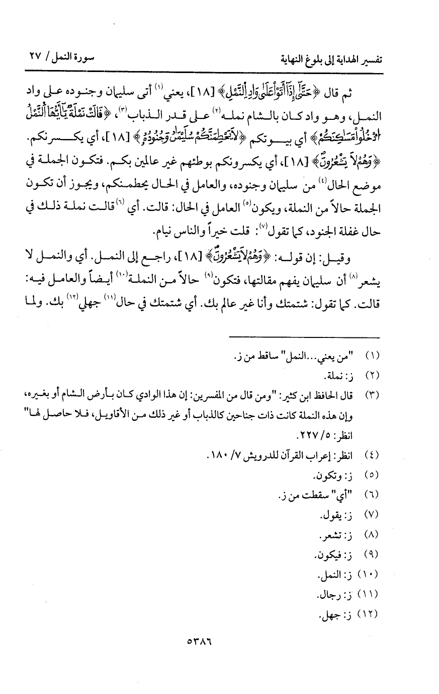 قال {حتى إِذَآ أَتَوْا على وَادِ النمل}، يعني أتى سليمان وجنوده على واد النمل، وهو واد كان بالشام نمله على قدر الذباب، {قَالَتْ نَمْلَةٌ يا أيها النمل ادخلوا مَسَاكِنَكُمْ} أي بيوتكم {لاَ يَحْطِمَنَّكُمْ سُلَيْمَانُ وَجُنُودُهُ}، أي يكسرنكم. {وَهُمْ لاَ يَشْعُرُونَ}، أي يكسرونكم بوطئهم غير عالمين بكم. فتكون الجملة في موضع الحال من سليمان وجنوده، والعامل في الحال يحطمنكم، ويجوز أن تكون الجملة حالاً من النملة، ويكون العامل في الحال: قالت. أي قالت نملة ذلك في حال غفلة الجنود، كما تقول: قلت خيراً والناس نيام.