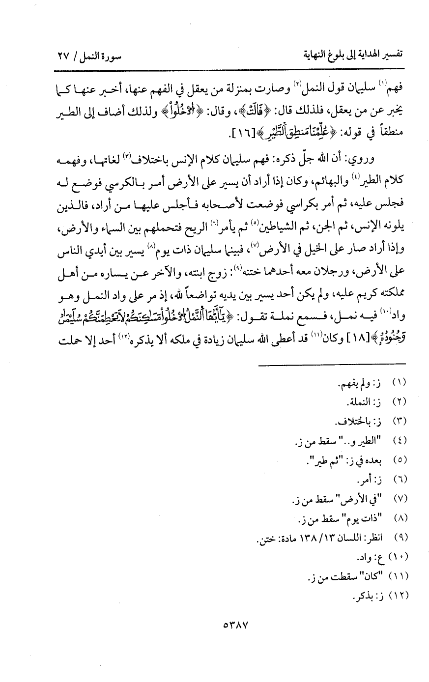 وروي: أن الله جلّ ذكره: فهم سليمان كلام الإنس باختلاف لغاتها، وفهمه كلام الطير والبهائم، وكان إذا أراد أن يسير على الأرض أمر بالكرسي فوضع له فجلس عليه، ثم أمر بكراسي فوضعت لأصحابه فأجلس عليها من أراد، فالذين يلونه الإنس، ثم الجن، ثم الشياطين ثم يأمر الريح فتحملهم بين السماء والأرض، وإذا أراد صار على الخيل في الأرض، فبينما سليمان ذات يوم يسير بين أيدي الناس على الأرض، ورجلان معه أحدهما ختنه: زوج ابنته، والآخر عن يساره من أهل مملكته كريم عليه، ولم يكن أحد يسير بين يديه تواضعاً لله، إذ مر على واد النمل وهو واد فيه نمل، فسمع نملة تقول: {يا أيها النمل ادخلوا مَسَاكِنَكُمْ لاَ يَحْطِمَنَّكُمْ سُلَيْمَانُ وَجُنُودُهُ} وكان قد أعطى الله سليمان زيادة في ملكه ألا يذكره أحد إلا حملت