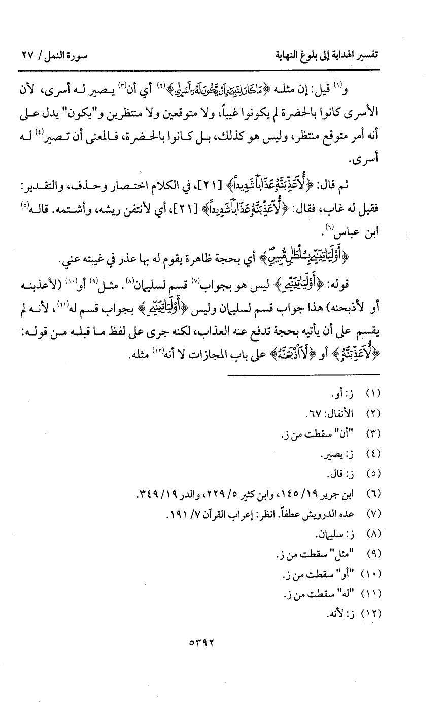 قوله: {أَوْ لَيَأْتِيَنِّي} ليس هو بجواب قسم لسليمان. مثل أو (لأعذبنه أو لأذبحنه) هذا جواب قسم لسليمان وليس {أَوْ لَيَأْتِيَنِّي} بجواب قسم له، لأنه لم يقسم على أن يأتيه بحجة تدفع عنه العذاب، لكنه جرى على لفظ ما قبله من قوله: {لأُعَذِّبَنَّهُ} أو {لأَاْذبَحَنَّهُ} على باب المجازات لا أنه مثله.