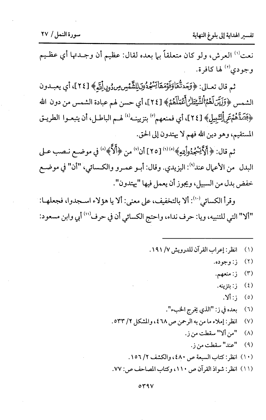 قال: {أَلاَّ يَسْجُدُواْ للَّهِ} أن من {أَلاَّ} في موضع نصب على البدل من الأعمال عند: اليزيدي. وقال: أبو عمرو والكسائي، " أن " في موضع خفض بدل من السبيل، ويجوز أن يعمل فيها " يهتدون ".