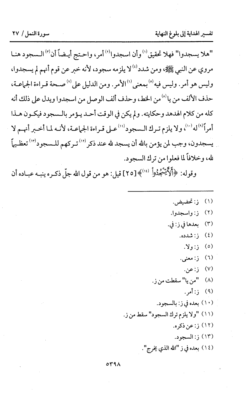 " هلا يسجدوا " فهلا تحقيق وأن اسجدوا أمر، واحتج أيضاً أن السجود هنا مروي عن النبي A، ومن شدد لا يلزمه سجود، لأنه خبر عن قوم أنهم لم يسجدوا، وليس هو أمر. وليس فيه بمعنى الأمر. ومن الدليل على صحة قراءة الجماعة، حذف الألف من يا من الخط، وحذف ألف الوصل من اسجدوا ويدل على ذلك أنه كله من كلام الهدهد وحكايته. ولم يكن في الوقت أحد يؤمر بالسجود فيكون هذا أمراً له، ولا يلزم ترك السجود على قراءة الجماعة، لأنه لما أخبر أنهم لا يسجدون، وجب لمن يؤمن بالله أن يسجد لله عند ذكر تركهم للسجود تعظيماً لله، وخلافاً لما فعلوا من ترك السجود.