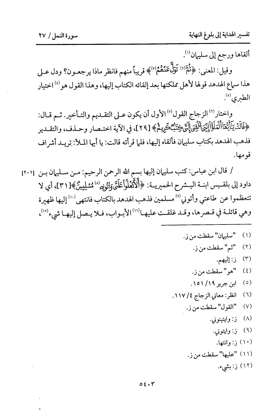 واختار الزجاج القول الأول أن يكون على التقديم والتأخير. ثم قال: {قَالَتْ يا أيها الملأ إني أُلْقِيَ إِلَيَّ كِتَابٌ كَرِيمٌ}، في الآية اختصار وحذف، والتقدير فذهب الهدهد بكتاب سليمان فألقاه إليها، فلما قرأته قالت: يا أيها الملأ: تريد أشراف قومها.