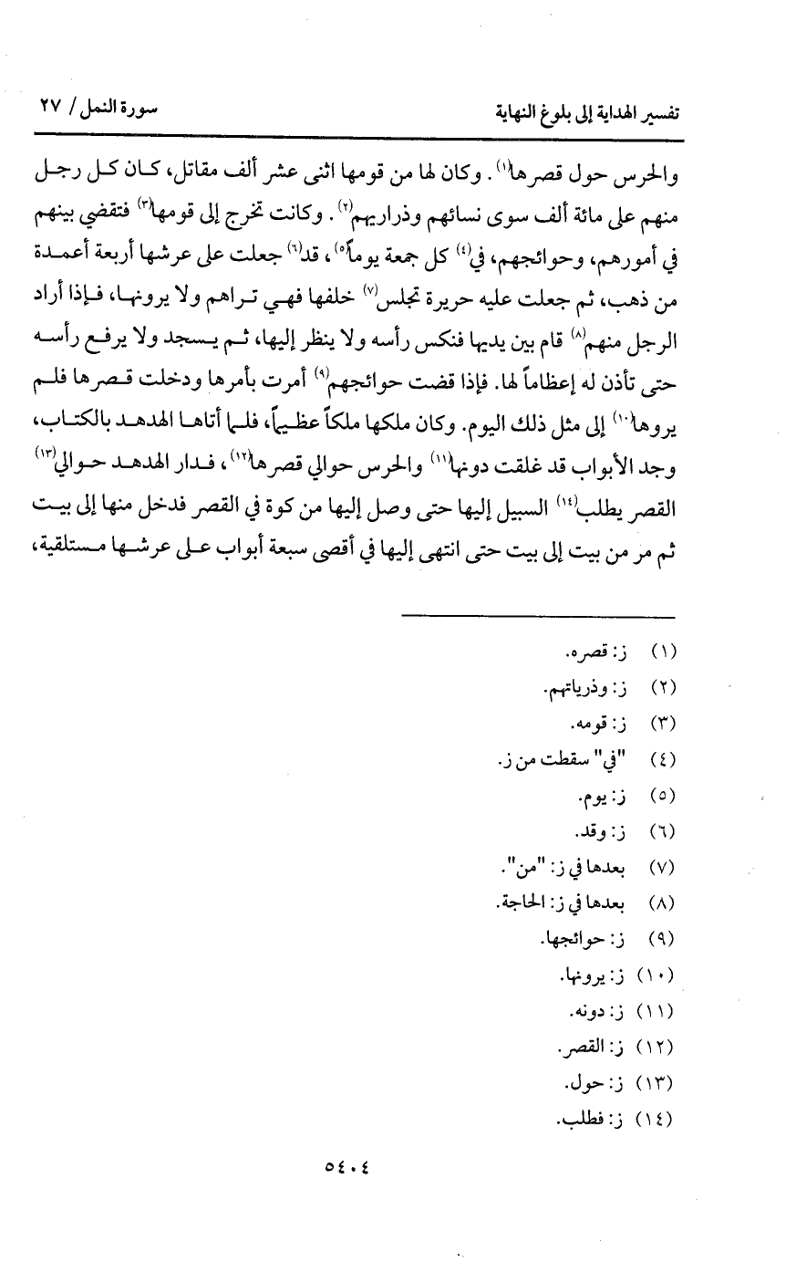 والحرس حول قصرها. وكان لها من قومها اثنى عشر ألف مقاتل، كان كل رجل منهم على مائة ألف سوى نسائهم وذراريهم. وكانت تخرج إلى قومها فتقضي بينهم في أمورهم، وحوائجهم، في كل جمعة يوماً قد جعلت على عرشها أربعة أعمدة من ذهب، ثم جعلت عليه حريرة تجلس خلفها فهي تراهم ولا يرونها، فإذا أراد الرجل منهم قام بين يديها فنكس رأسه ولا ينظر إليها، ثم يسجد ولا يرفع رأسه حتى تأذن له إعظاماً لها. فإذا قضت حوائجهم أمرت بأمرها ودخلت قصرها فلم يورها إلى مثل ذلك اليوم. وكان ملكها ملكاً عظيماً، فلما أتاها الهدهد بالكتاب، وجد الأبواب قد غلقت دونها والحرس حوالي قصرها، فدار الهدهد حوالي القصر يطلب السبيل إليها حتى وصل إليها من كوة في القصر فدخل منها إلى بيت ثم مر من بيت إلى بيت حتى انتهى إليها في أقصى سبعة أبواب على عرشها مستلقية،