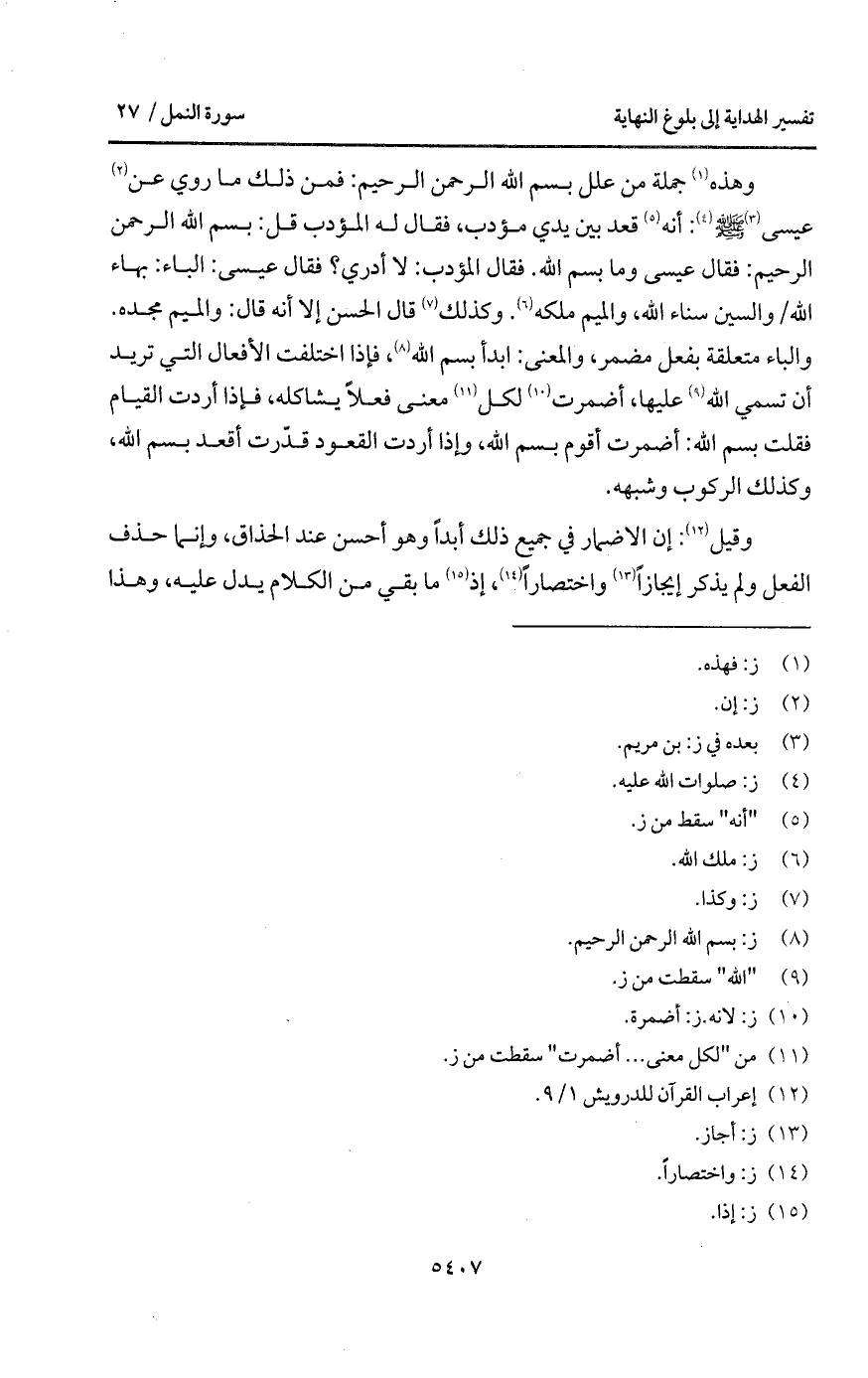 وهذه جملة من علل بسم الله الرحمن الرحيم: فمن ذلك ما روي عن عيسى A: أنه قعد بين يدي مؤدب، فقال له المؤدب قل: بسم الله الرحمن الرحيم: فقال عيسى وما بسم الله. فقال المؤدب: لا أدري؟ فقال عيسى: الباء: بهاء الله / والسين سناء الله، والميم ملكه. وكذلك قال الحسن إلا أنه قال: والميم مجده. والباء متعلقة بفعل مضمر، والمعنى: ابدأ بسم الله، فإذا اختلفت الأفعال التي تريد أن تسمي الله عليها، أضمرت لكل معنى فعلاً يشاكله، فإذا أردت القيام فقلت بسم الله: أضمرت أقوم بسم الله، وإذا أردت القعود قدّرت أقعد بسم الله، وكذلك الركوب وشبهه.