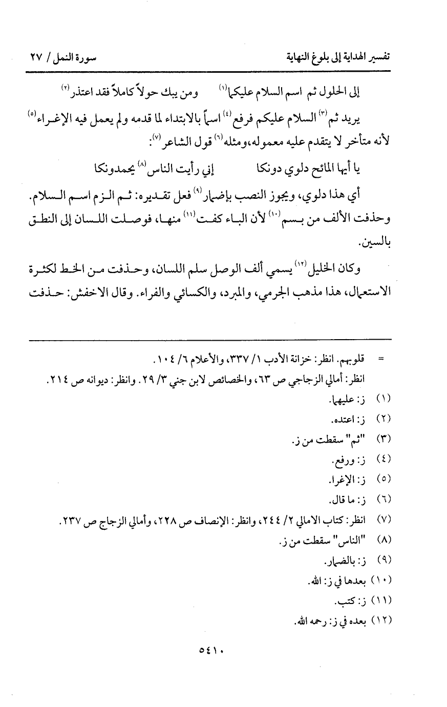 يريد ثم السلام عليكم فرفع اسماً بالابتداء لما قدمه ولم يعمل فيه الإغراء لأنه متأخر لا يتقدم عليه معموله، ومثله قول الشاعر: