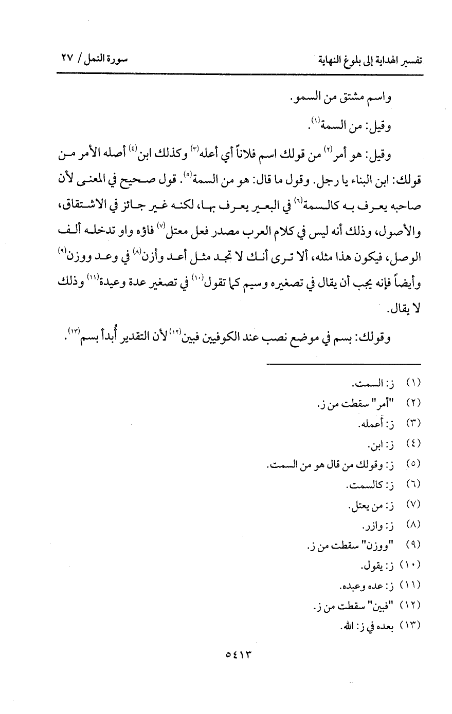 وقيل: هو أمر من قولك اسم فلاناً أي أعله وكذلك ابن أصله الأمر من قولك: ابن البناء يا رجل. وقول ما قال: هو من السمة. قول صحيح في المعنى لأن صاحبه يعرف به كالسمة في البعير يعرف بها، لكنه غير جائز في الاشتقاق، والأصمول، وذلك أنه ليس في كلام العرب مصدر فعل معتل فاؤه واو تدخله ألف الوصل، فيكون هذا مثله، ألا ترى أنك لا تجد مثل أعد وأزن في وعد ووزن وأيضاً فإنه يجب أن يقال في تصغيره وسيم كما تقول في تصغير عدة وعيدة وذلك لا يقال.