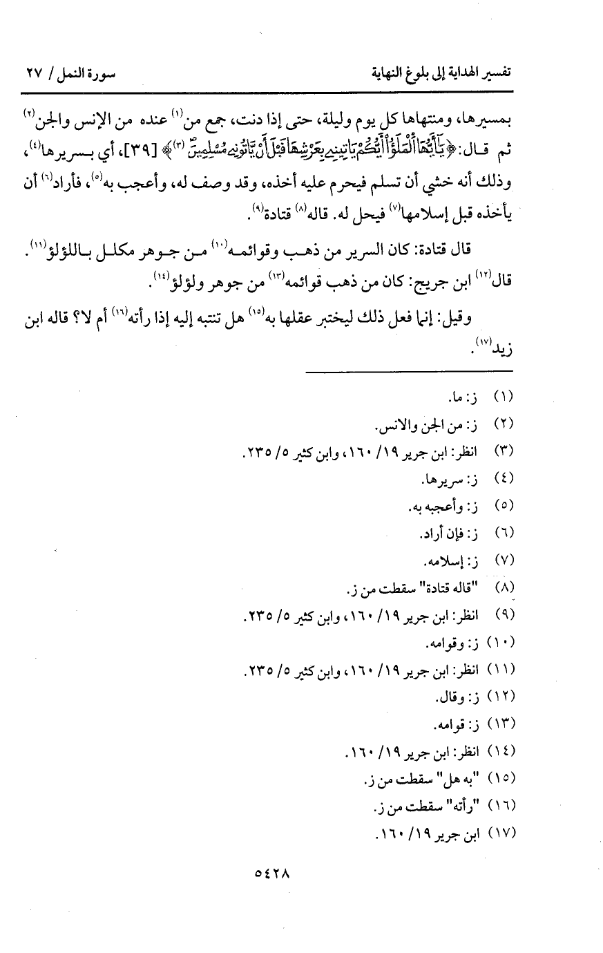 بمسيرها، ومنهاها كل يوم وليلة، حتى إذا دنت، جمع من عنده من الإنس والجن ثم قال: {يا أيها الملأ أَيُّكُمْ يَأْتِينِي بِعَرْشِهَا قَبْلَ أَن يَأْتُونِي مُسْلِمِينَ}، أي بسريرها، وذلك أنه خشي أن تسلم فيحرم عليه أخذه، وقد وصف له، وأعجب به، فأراد أن يأخذه قبل إسلامها فيحل له. قاله قتادة.