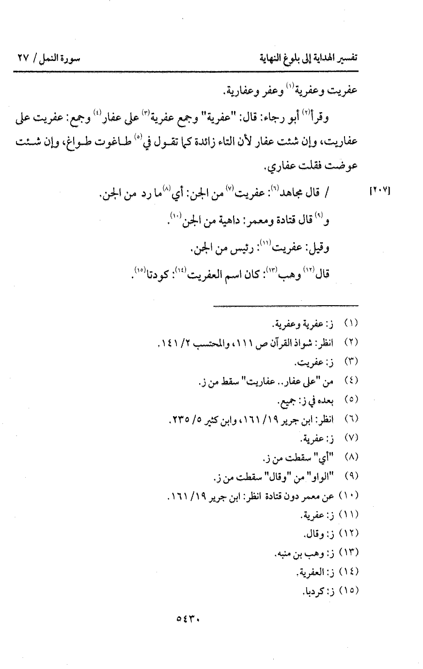 وقرأ أبو رجاء: قال: " عفرية " وجمع عفرية على عفار وجمع: عفريت على عفاريت، وإن شئت عفار لأن التاء زائدة كما تقول في طاغوت طواغ، وإن شئت عوضت فقلت عفاري.